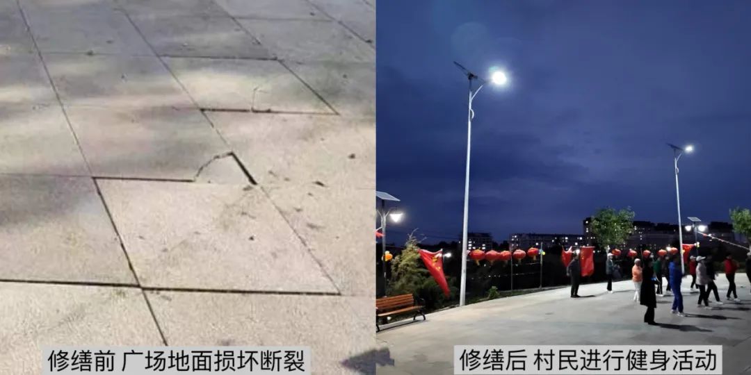 接到百姓反映后,市水利局立即调度工作人员到现场查看,对存在的一些问题进行拍照记录和规划布置,当天下午就修缮了广场边的坏椅子。又多次到实地调研,与村民代表、施工单位共同协商,确定改造方案和施工时间。投入资金1万余元,共安装8米太阳能路灯2盏、太阳能庭院灯(双灯)1盏、长条椅4把,重新修缮填平广场地面30平米,应群众所需,为群众排忧解难,将休闲广场提档升级。